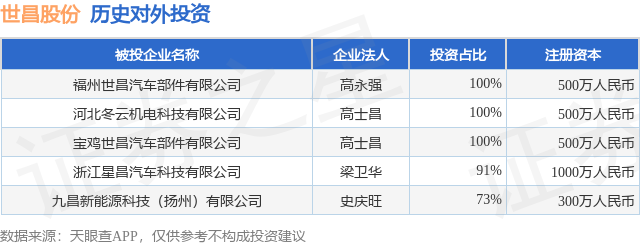 本站消息,根据天眼查APP显示,世昌股份(920022.BJ)新增一起对外投资事件,被投资公司为福州世昌汽车部件有限公司,法定代表人高永强,投资占比为100%。该公司从事汽车制造业,注册资本为500万人民币。目前,世昌股份共存在对外投资5项倍选网,详见下表: