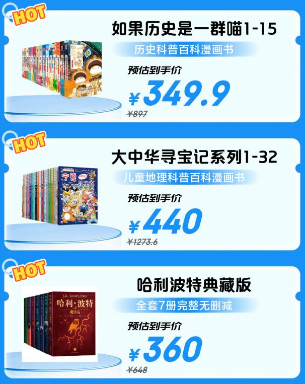 为孩子的书房添彩,为青少年的书单扩容,本次爆品直降书单精准覆盖家庭阅读需求。《如果历史是一群喵1-15》以独特诙谐的画风,将复杂历史化为轻松趣谈;《大中华寻宝记系列1-32》借引人入胜的寻宝故事,开启穿梭全国的文化之旅;而《哈利波特典藏版》则以精美装帧和完整故事,成为书架上永恒的魔法经典。多款热门好书直降好价,无需凑单,点击即买,一步购齐心仪读物。