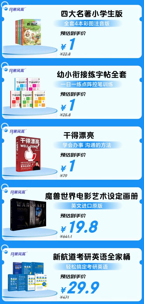 与此同时,10月9日晚8点,京东图书“月黑风高”专场开启限量预约,精选好书价格直探底价,部分读物低至1元。其中,《四大名著小学生版》以通俗语言引领孩子古典文学启蒙;《幼小衔接练字帖全套》通过科学笔画规划,夯实学前书写基础;《干得漂亮》则聚焦职场沟通与自我提升,为读者提供实用的人际交往与效率提升指南,三款好书均以1元秒杀。专场同时上线《魔兽世界电影艺术设定画册》与《新航道考研英语全家桶》等多重选择,无论是满足个人兴趣收藏,还是应对考试升学需求,均能在此觅得心仪之选。别忘了提前进入专场预约,先人一步锁定超值好书。