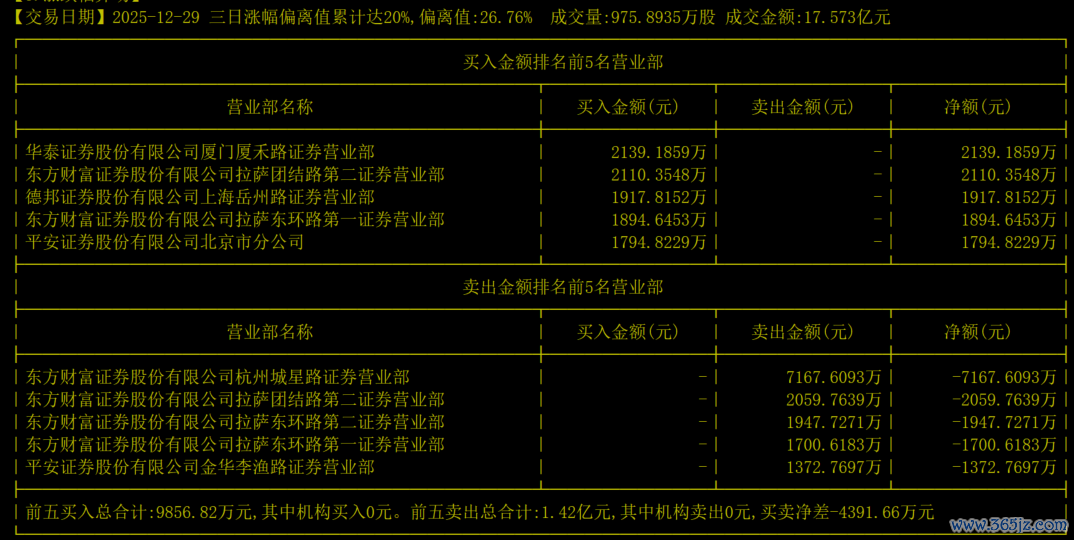 成交龙虎榜显示,在截至2025年12月29日的三个交易日中,买卖前五席位均为游资席位,其中卖出前五席位的资金明显大于买入前五的资金,炒作资金落袋为安的迹象比较明显。