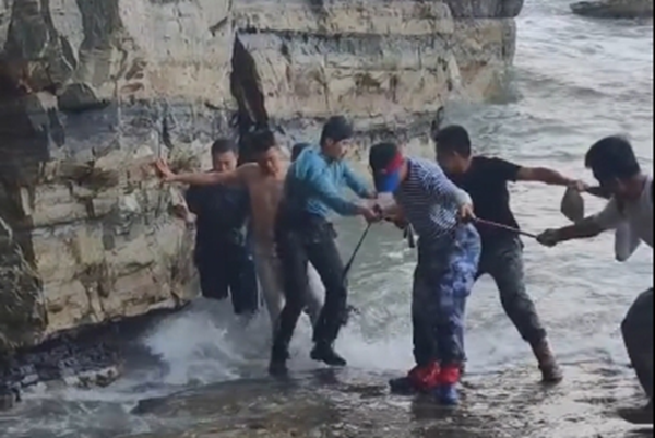记者从目击者拍摄的视频中看到,6月22日清晨,一名身穿蓝色上衣的男子仰面漂在海上,距离岸边十多米。海浪将游客越推越远,岸上的群众把登山杖和衣服绑在一起当作安全绳救援。“当时海浪特别大,游客被涌浪卷进去,无法自救。”张小龙回忆,“现场大概有40多人,大家都在想办法救人。”
