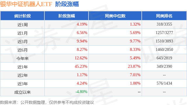 从业绩表现来看,银华中证机器人ETF基金过去一年净值涨幅为45.23%,在同类基金中排名349/2390,同类基金过去一年净值涨幅中位数为23.87%。而基金过去一年的最大回撤为-26.39%,成立以来的最大回撤为-48.71%。