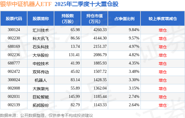 从基金规模来看,银华中证机器人ETF基金2025年二季度公布的基金规模为4.33亿元,较上一期规模4.35亿元变化了-243.9万元,环比变化了-0.56%。该基金最新一期资产配置为:股票占净值比98.53%,无债券类资产,现金占净值比2.2%。从基金持仓来看,该基金当季前十大股票仓位达48.86%,第一大重仓股为汇川技术(300124),持仓占比为9.84%。