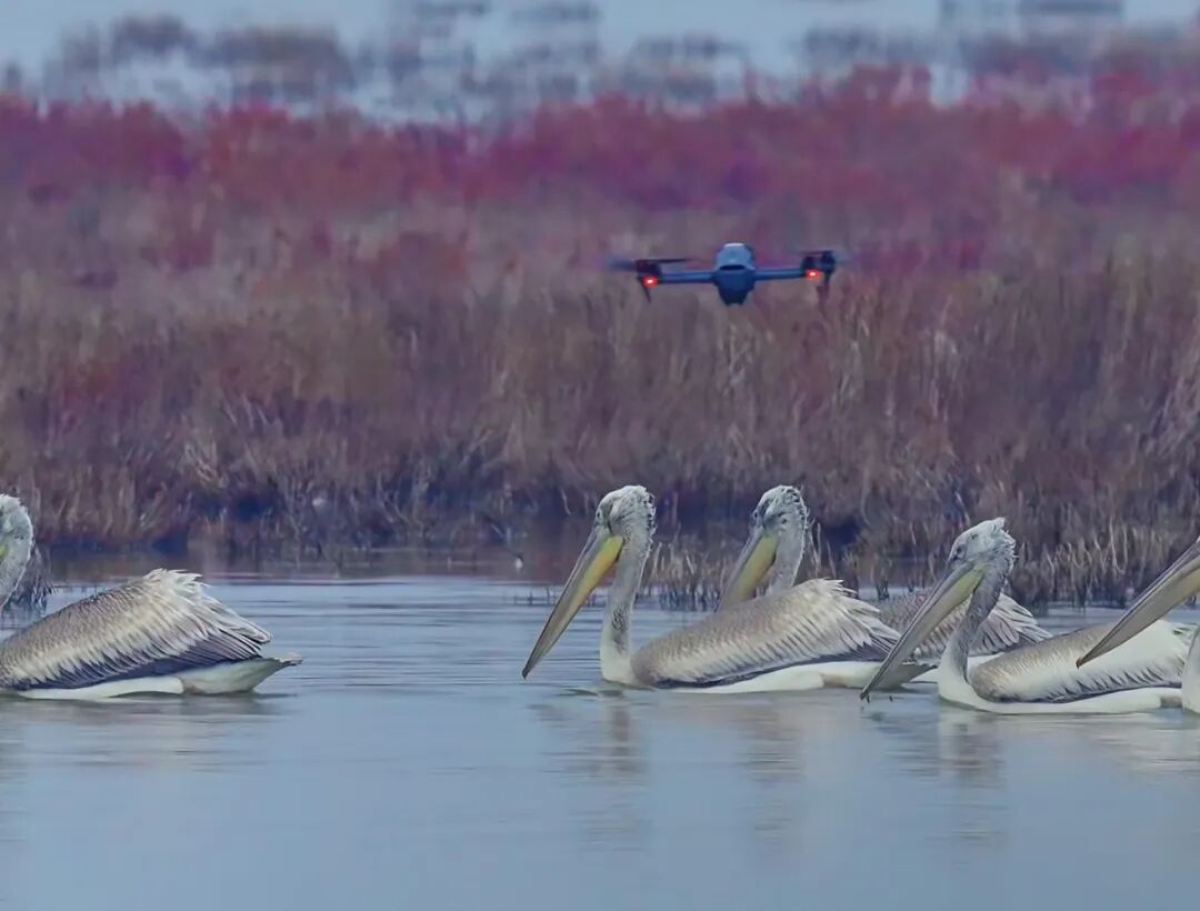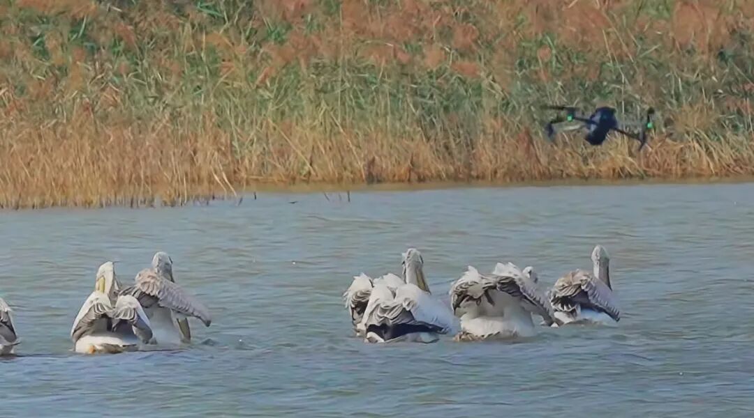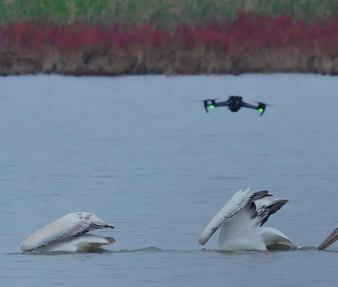 2025年9月通弘网,东营黄河口湿地,一架低飞的无人机正在靠近国家一级重点保护野生动物卷羽鹈鹕。图/受访者提供