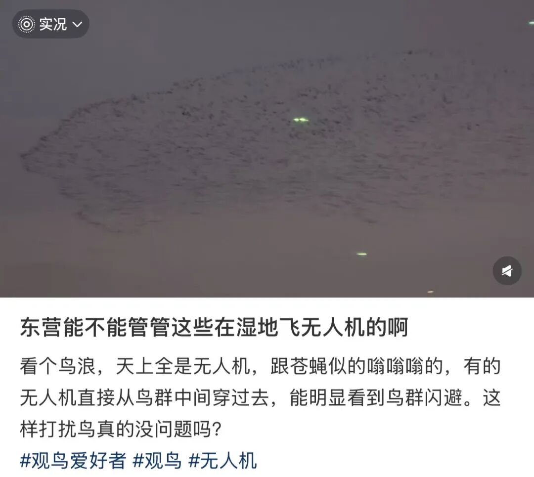 2025年10月,东营黄河口湿地,观鸟者发帖记录无人机冲进鸟群。图/网络截图